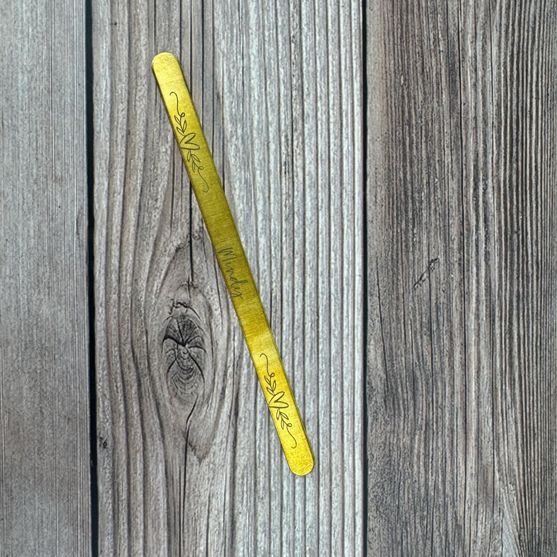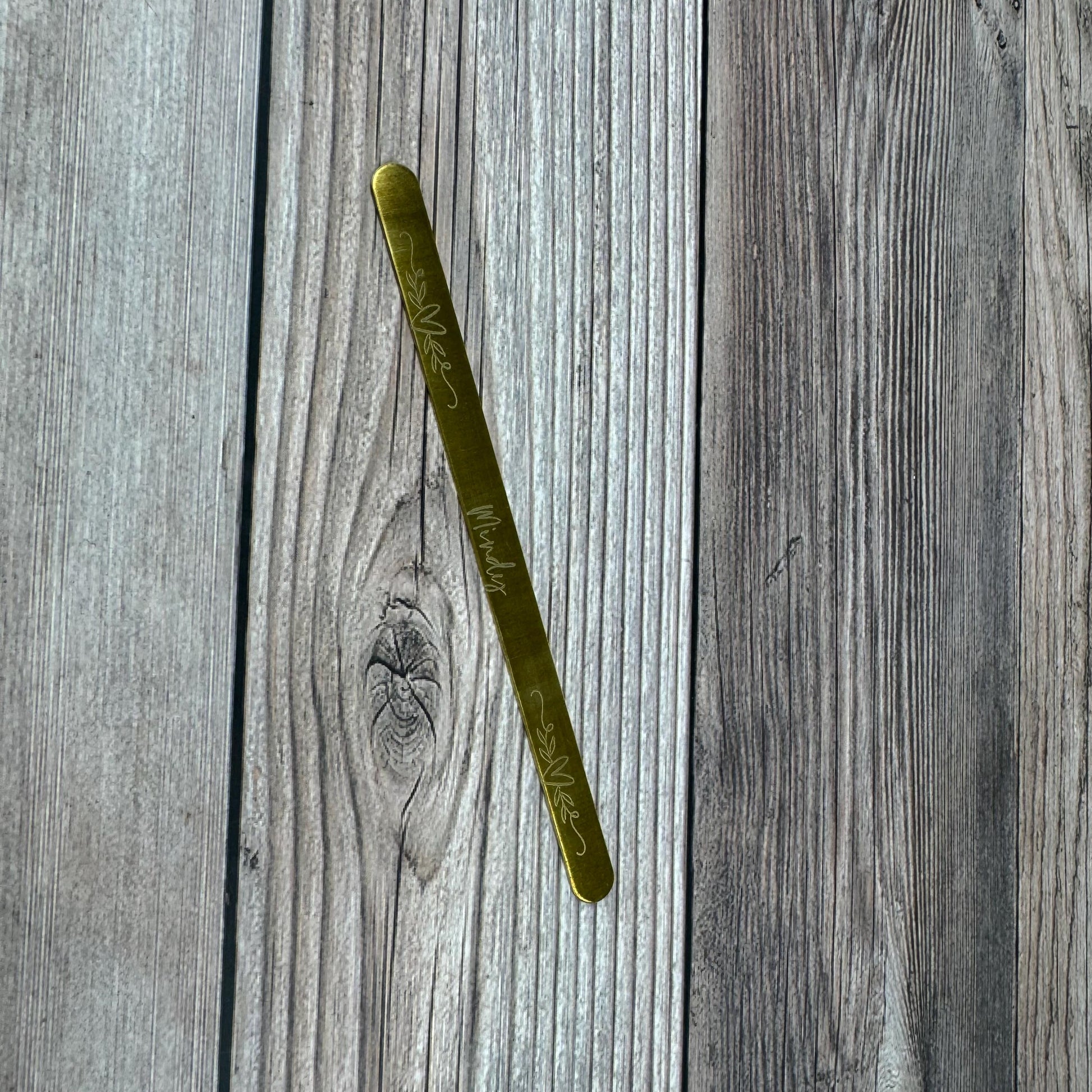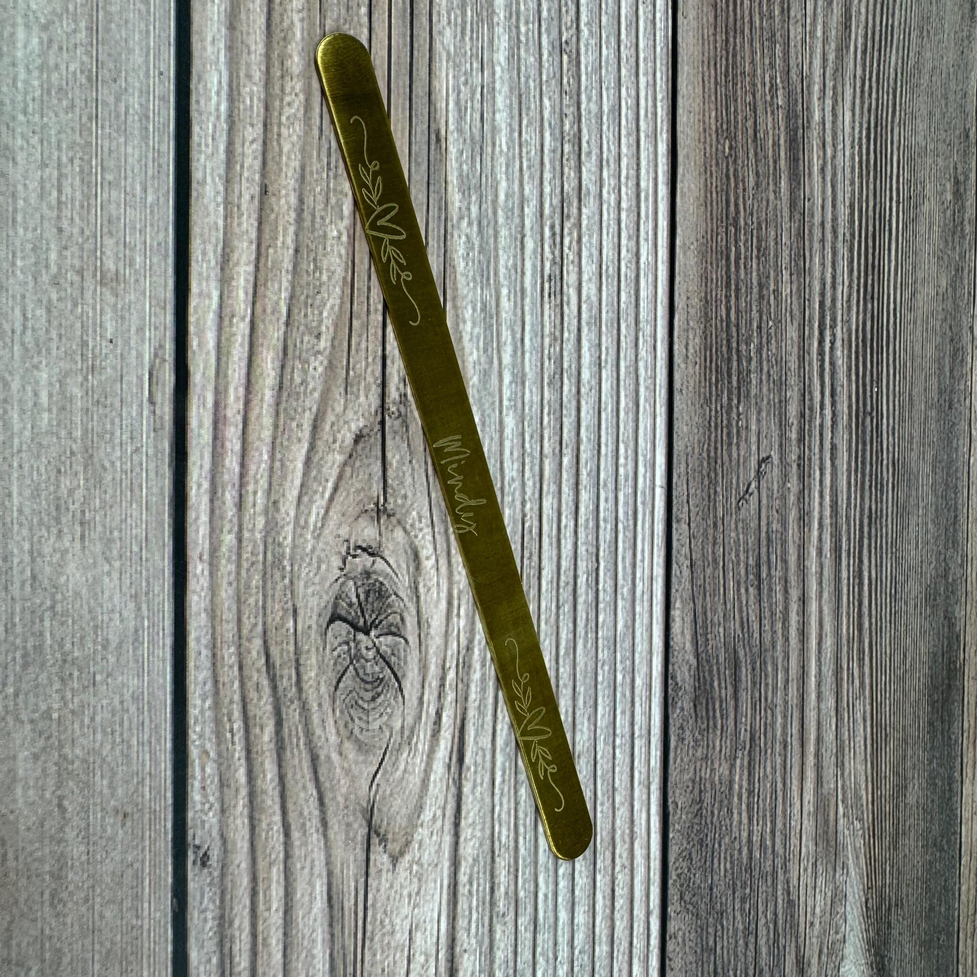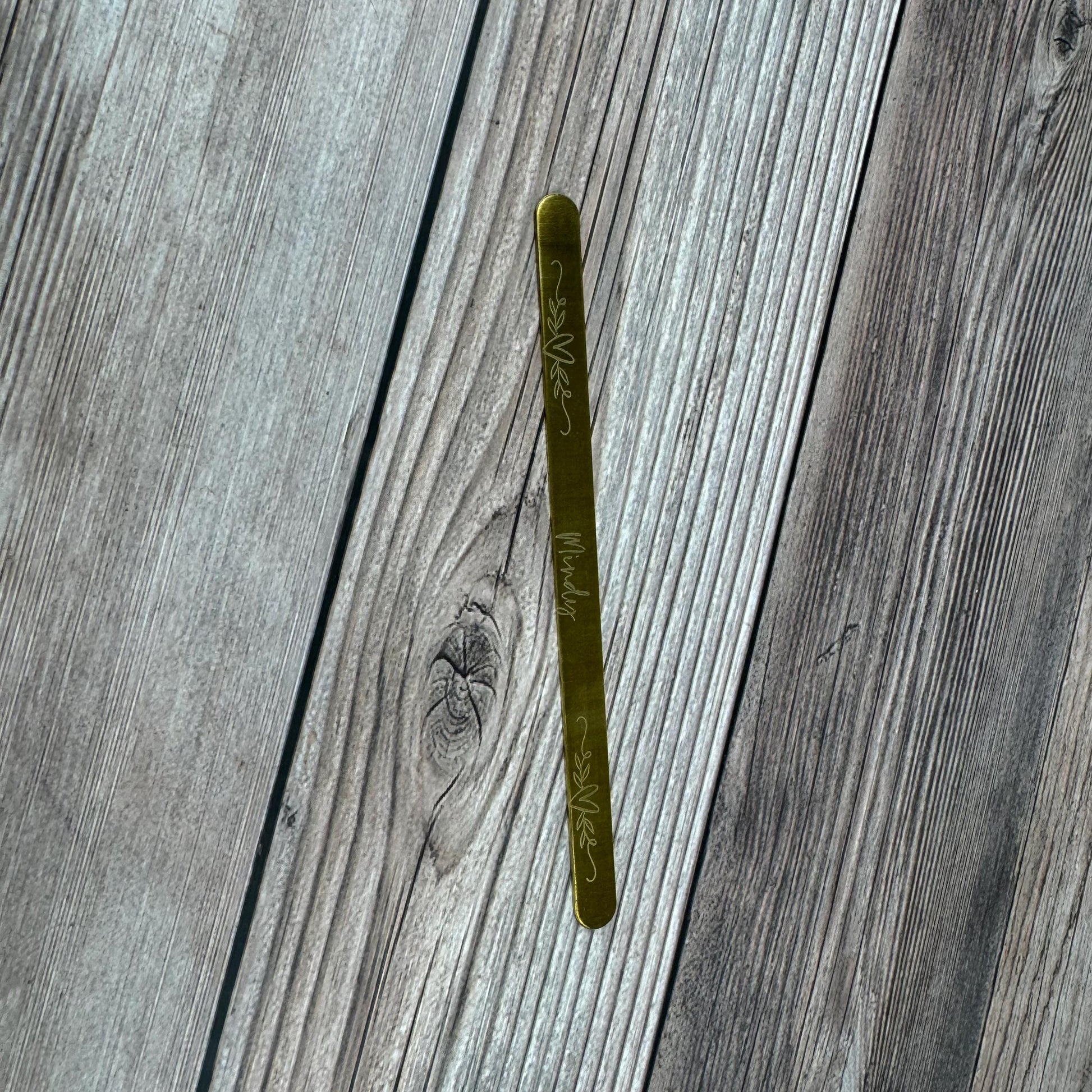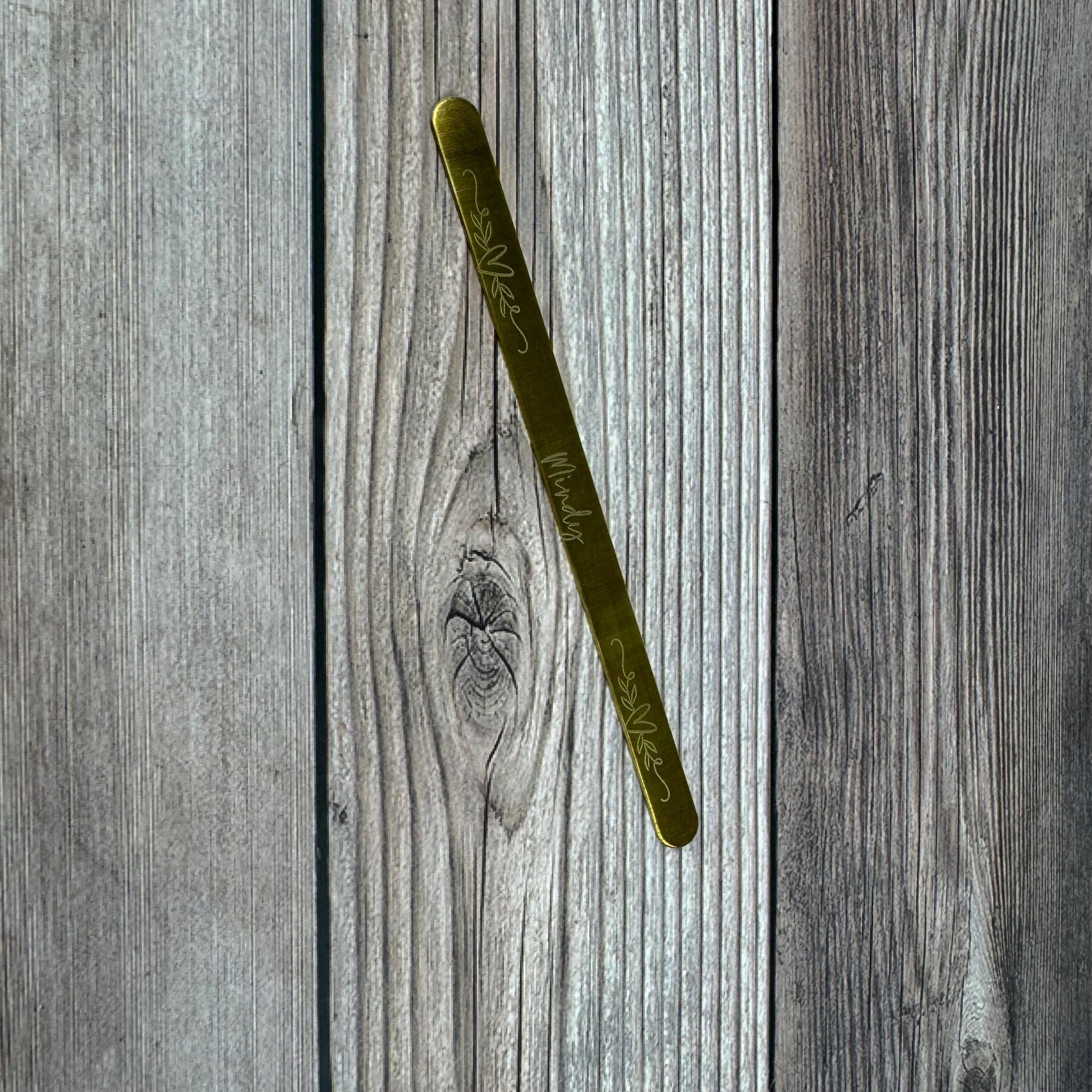 This brass bookmark measures 10mm wide and 170mm long. This bookmark is made of brass metal. The engraving is carved into the metal and will not wear off.