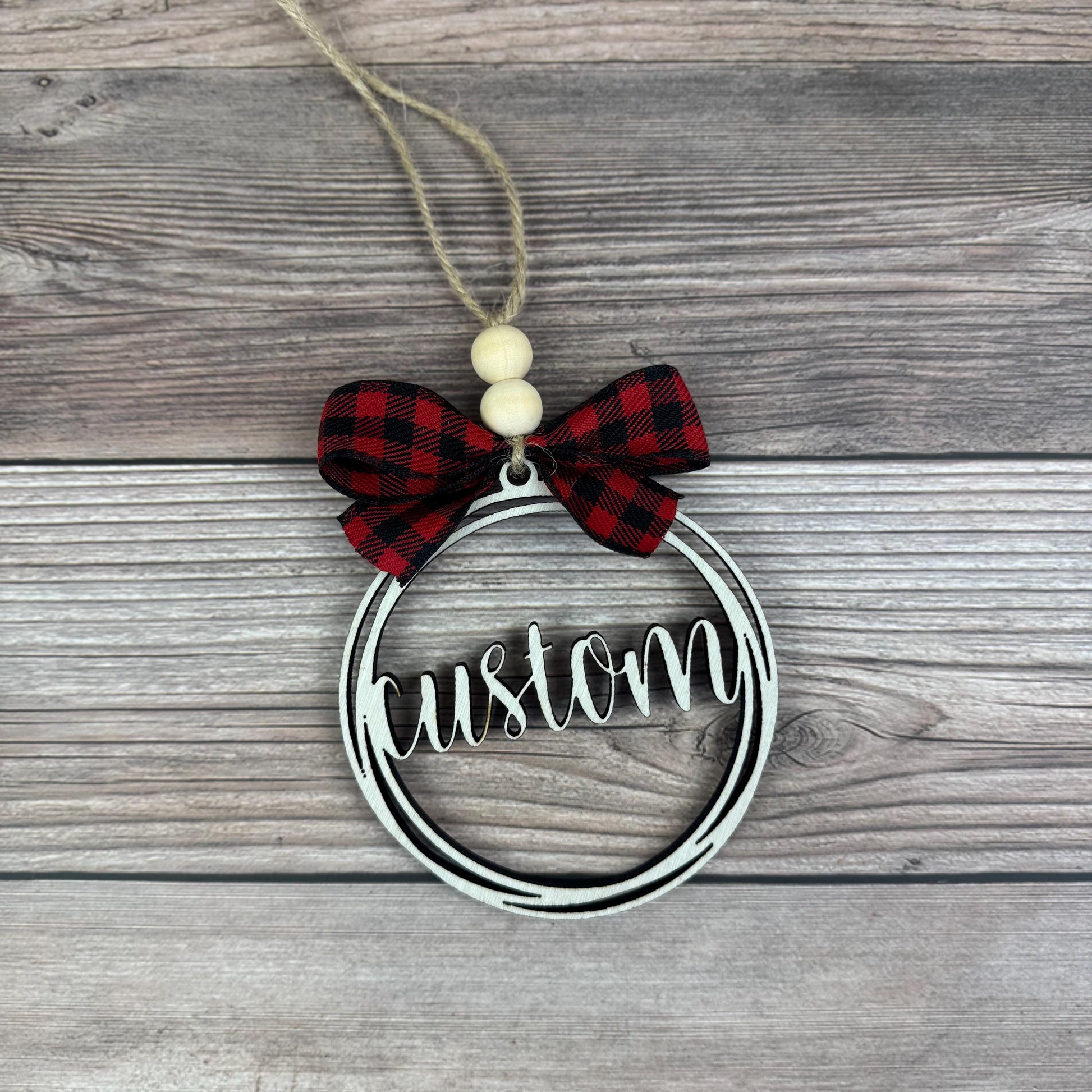 This charm is made cut from 1/8" painted MDF board. The back of the sign is also painted. There is a bow attached and 2 round wooden beads are added to the top.