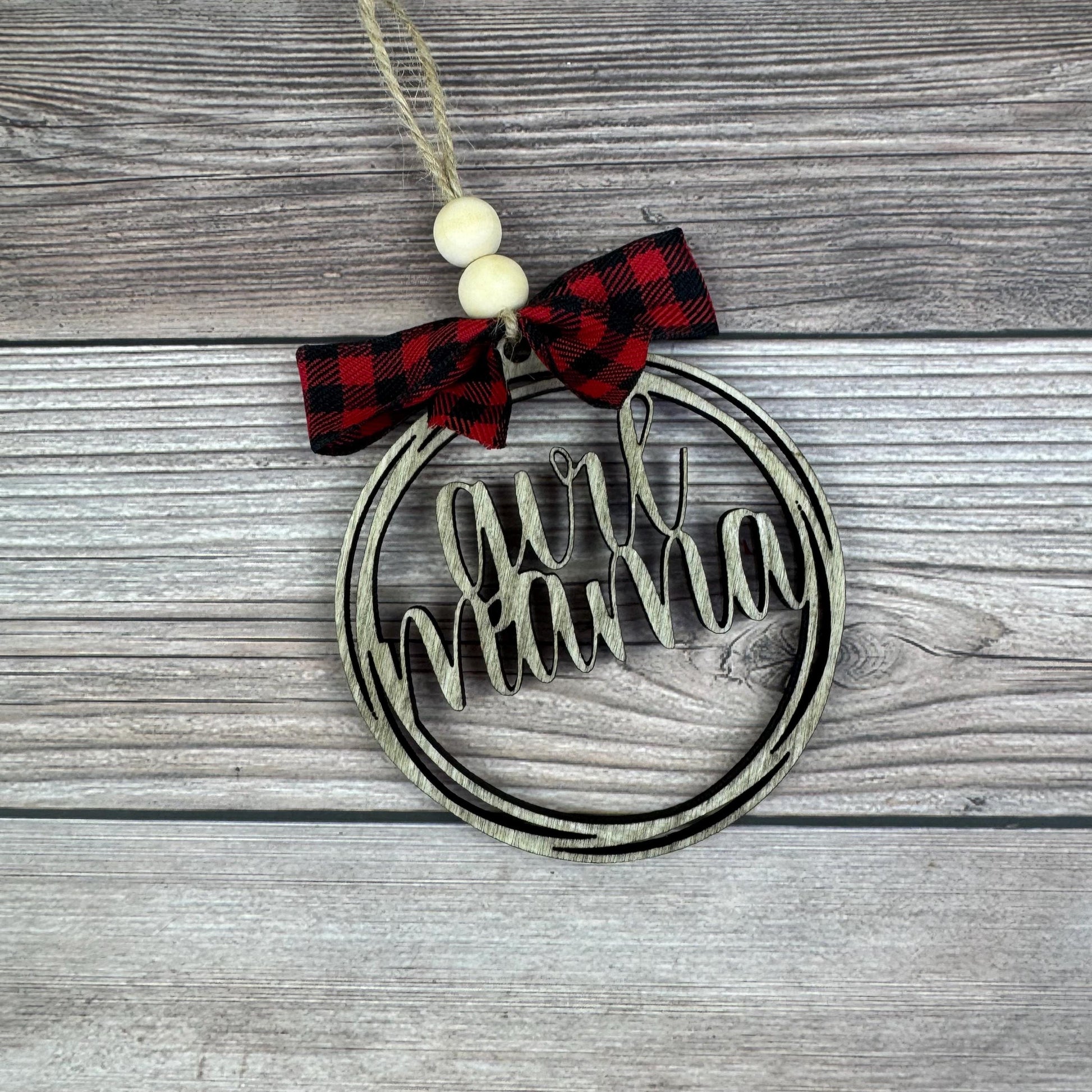 This charm is made cut from 1/8" painted MDF board. The back of the sign is also painted. There is a bow attached and 2 round wooden beads are added to the top.