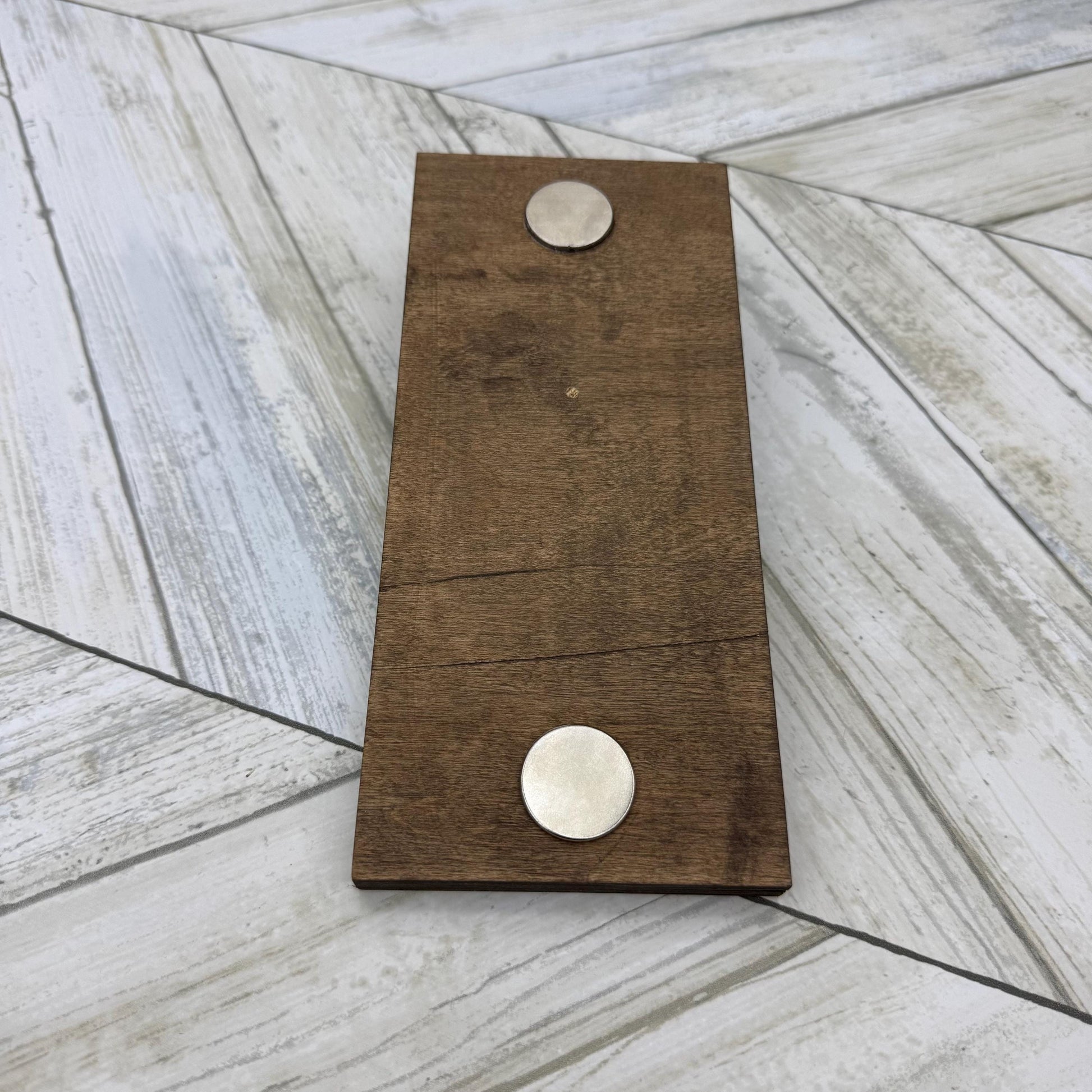 The personalized bottle opener measures 8 inches tall and 3.5 inches wide. 2 magnets are attached to the back. The design is engraved into the wood and will never wear off.