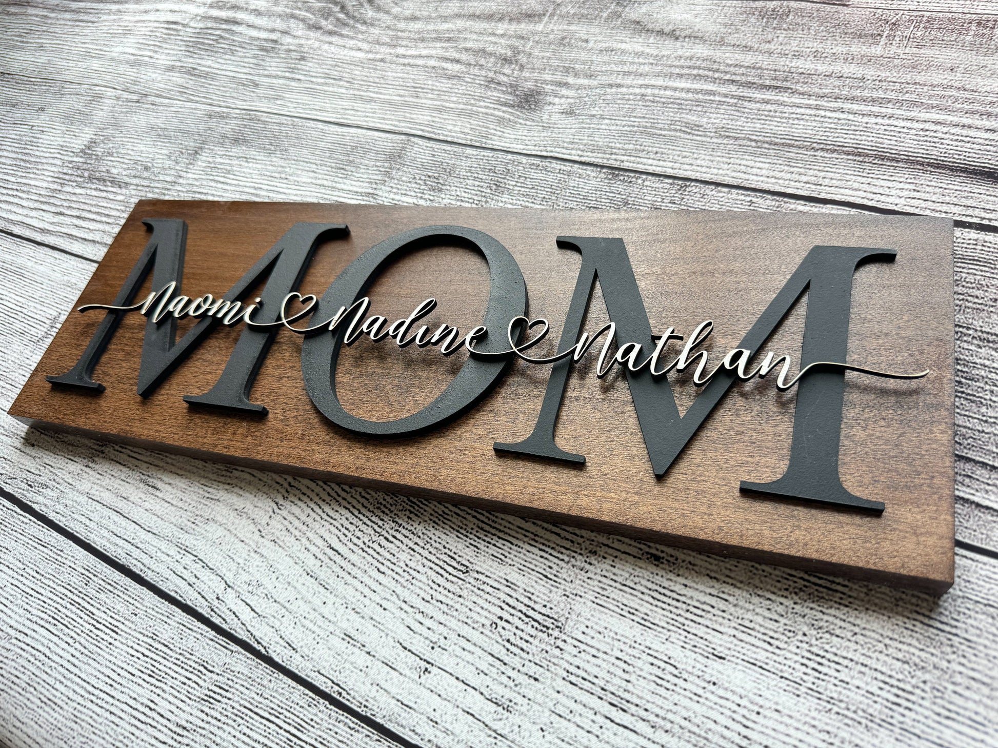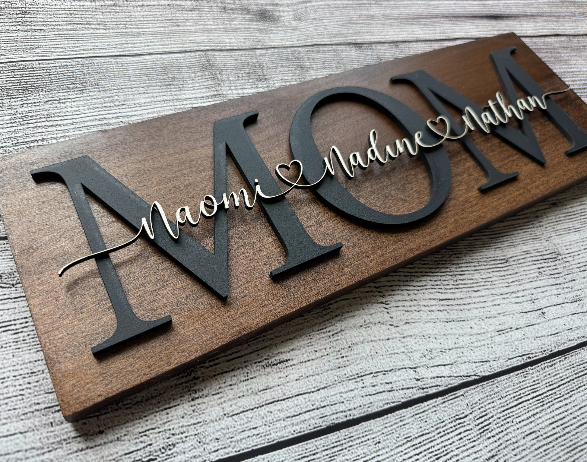 This signs made of 17.75"x 5.5"x .5" birch plywood. The sign is stained your color choice on all sides for a nice clean finish. The words MOM (or any other replacement ) is applied first using 1/8 inch MDF painted board. The Personalized Names are applied on the top layer using 1/8 inch MDF painted board. No hardware is included.