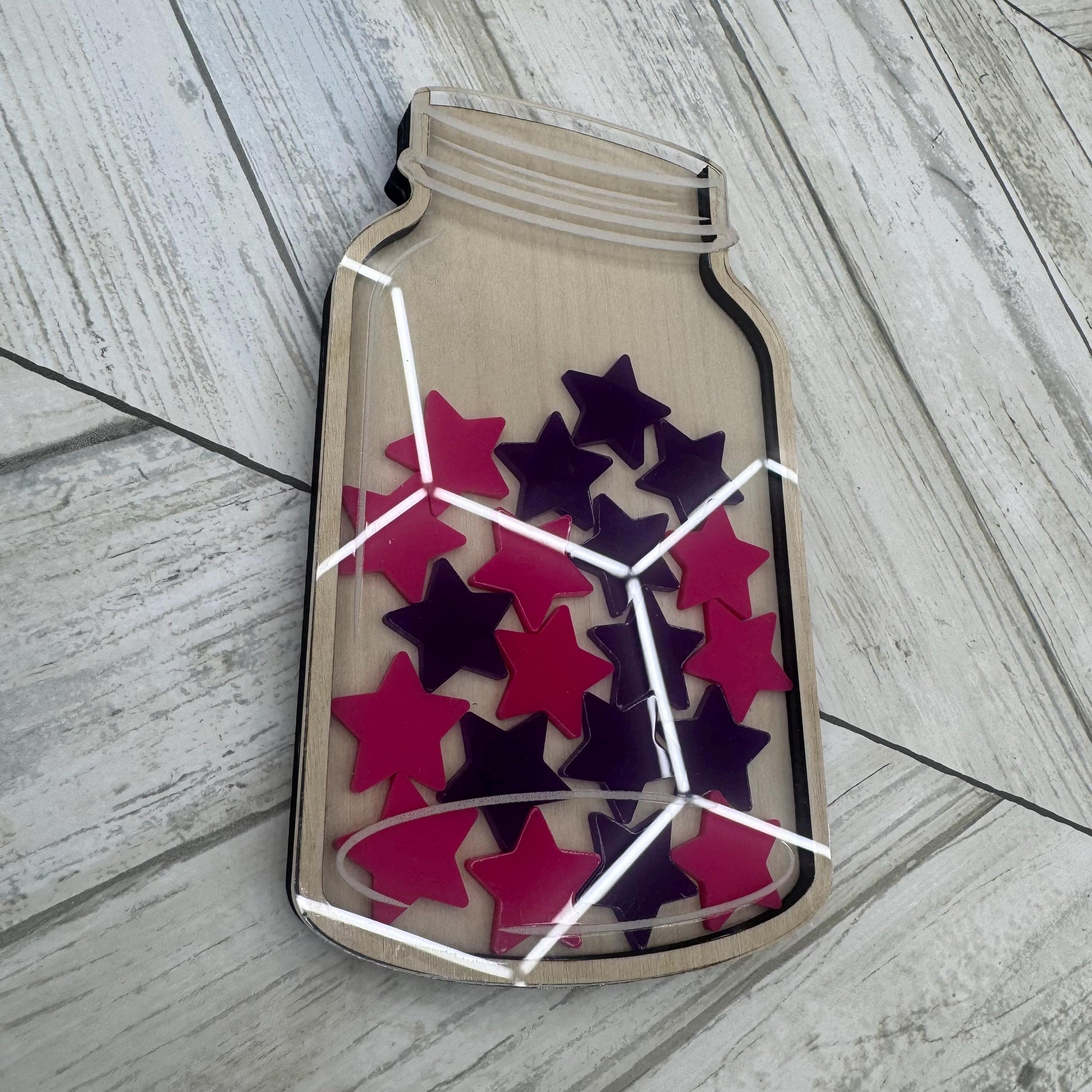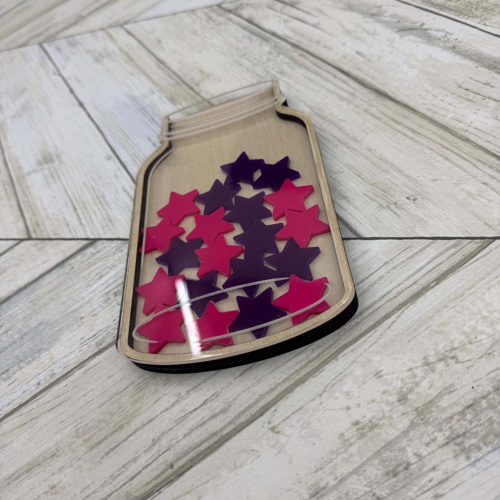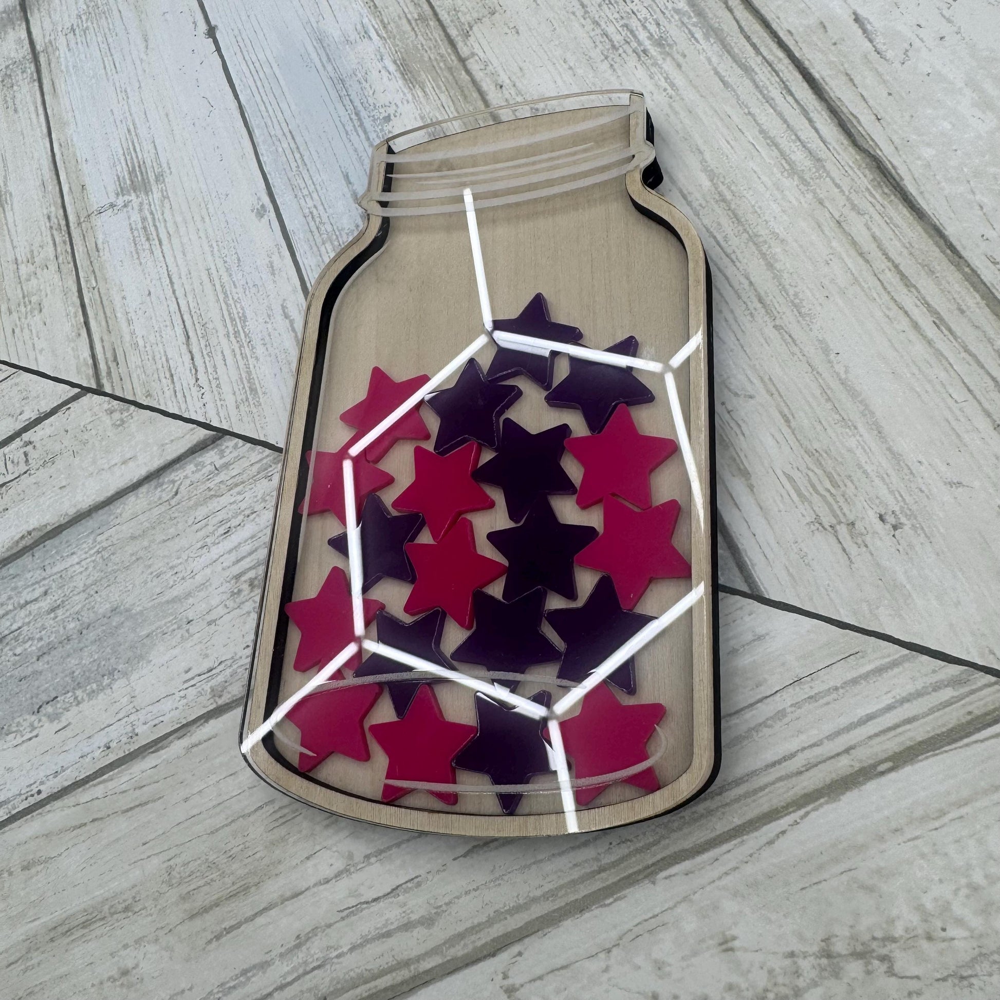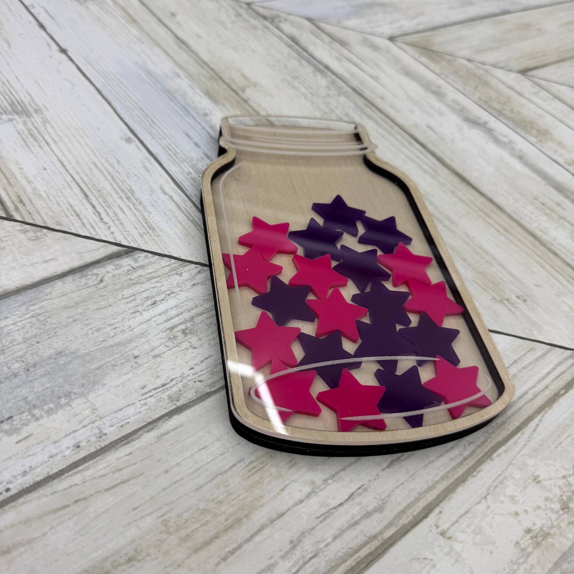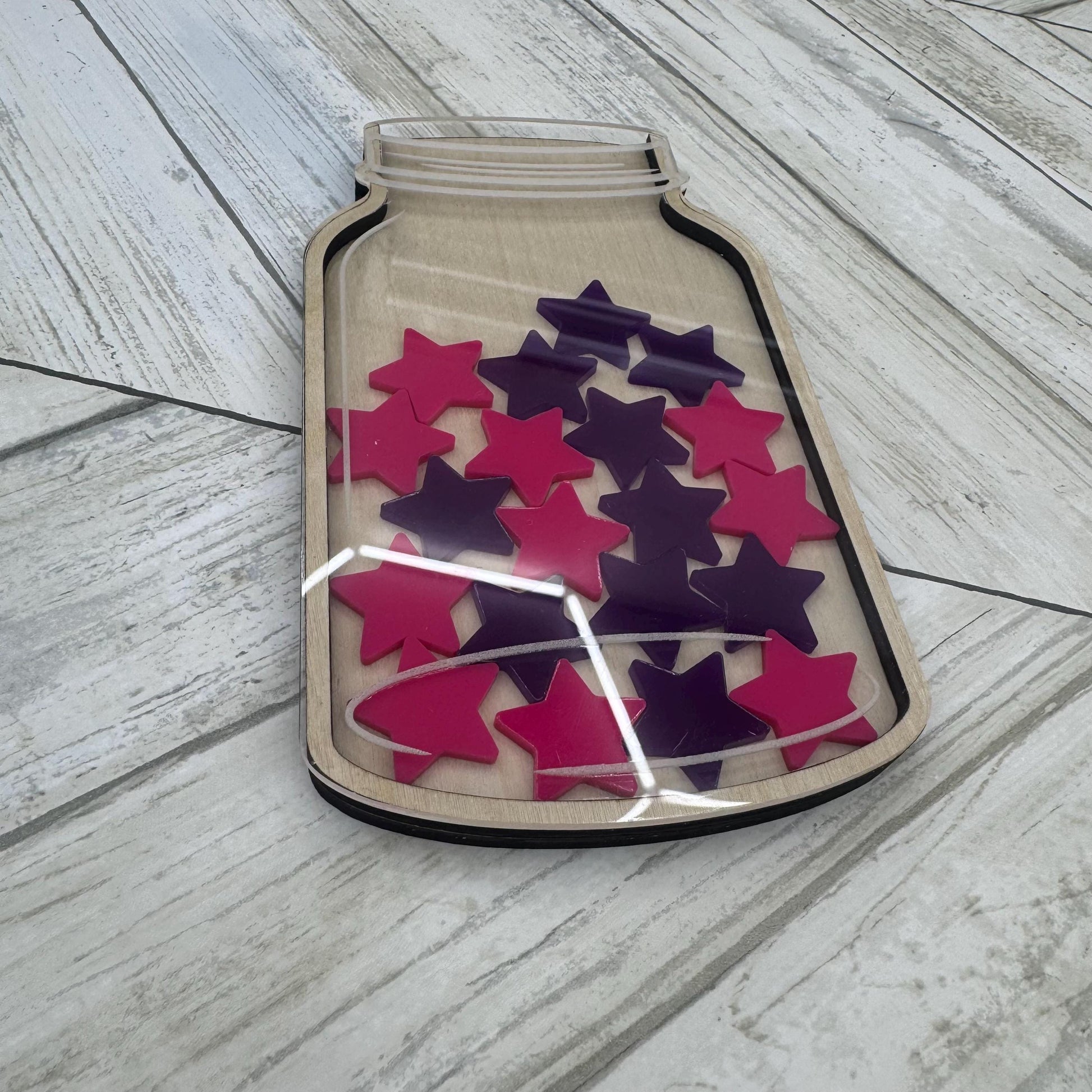 Each reward jar is approximately 3/8" thick and made of birch plywood. Each Jar is approximately 7" tall by 5" wide. The engraved details are only on the front. Stars a cut from colored acrylic. Choose your favorite color. 20 stars are included with each jar. Additional stars can be purchased. Choose from a stand or magnets added to the back for your display.