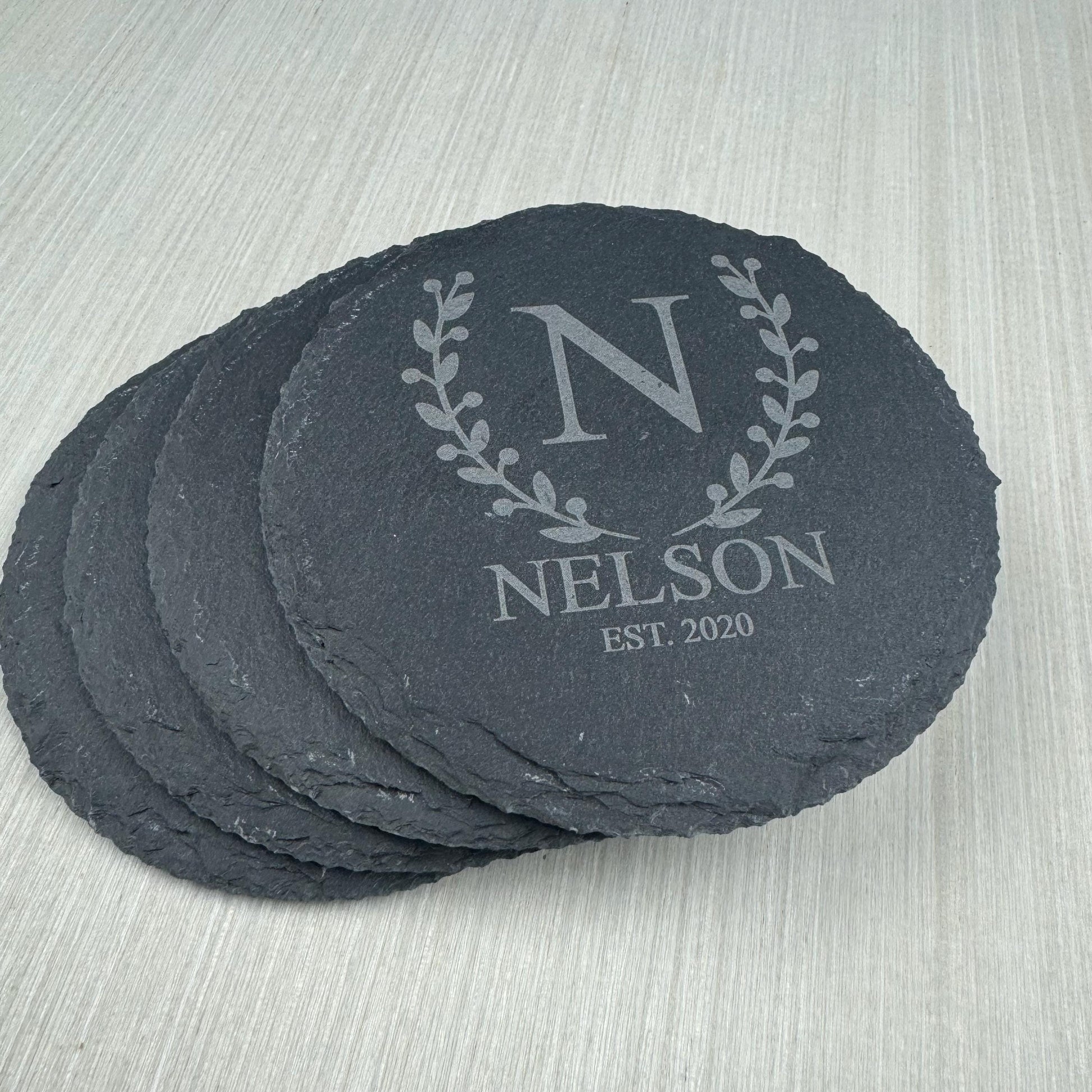 These slate stone drink coasters make the perfect personalized wedding gift. Housewarming gift or new home gifts are adored with this personalized option. The wreath monogram design will go great in any home.