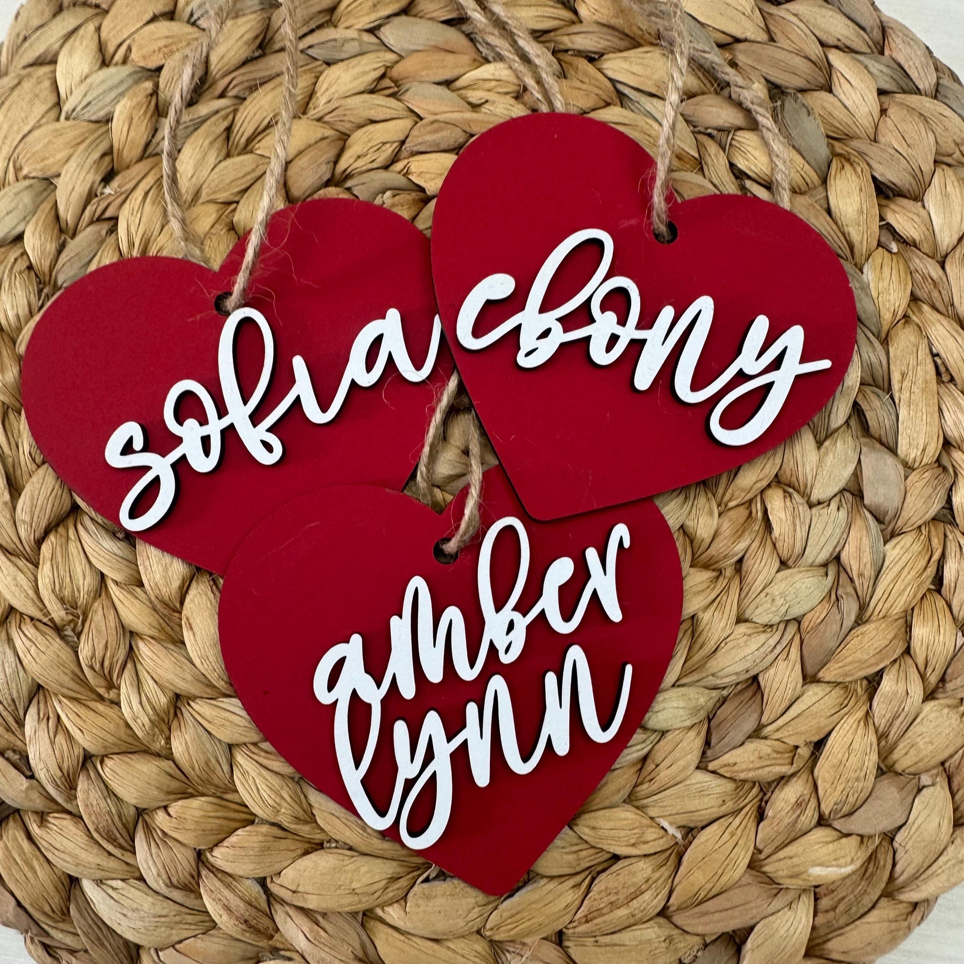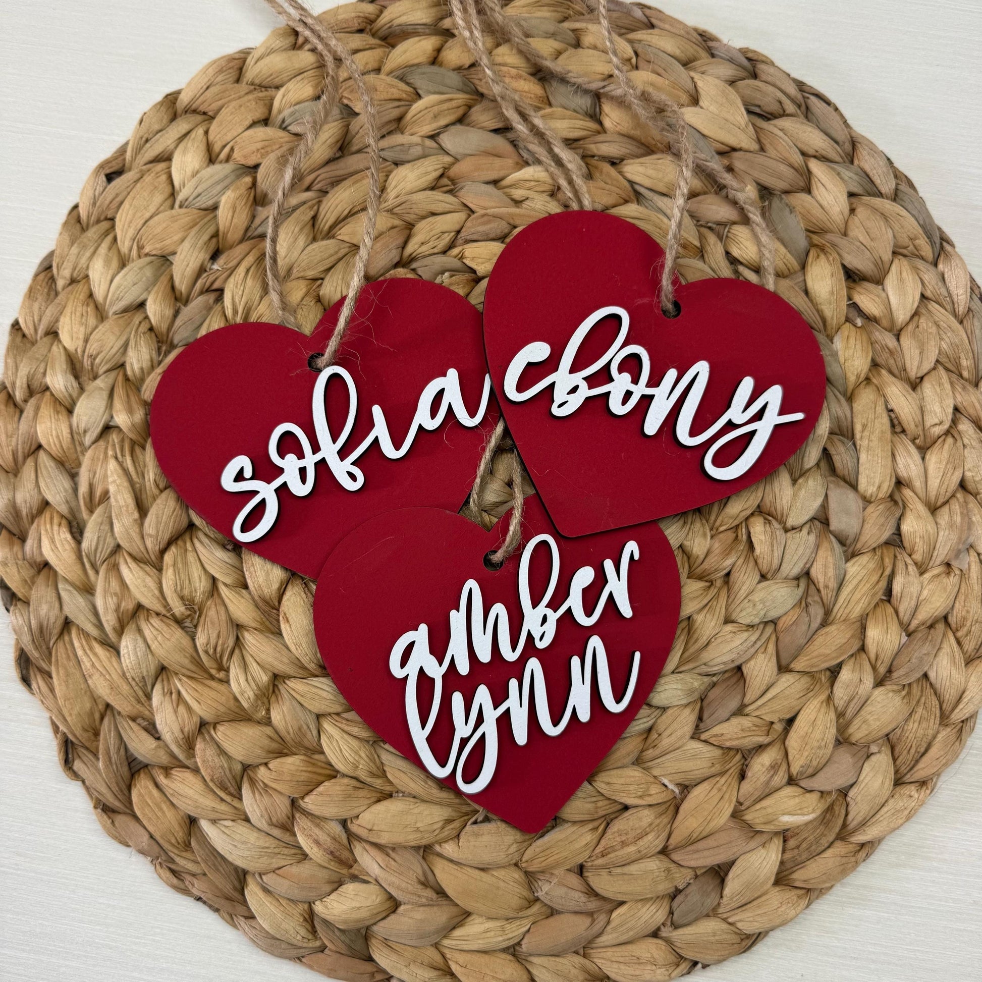 Each tag measures approximately 3.5" tall and 4" wide. The heart layer is made of 1/8" red painted wood The Personalized Names are applied as a top layer using 1/8" white painted MDF board. A jute cord is attached to the tag for easy hanging.