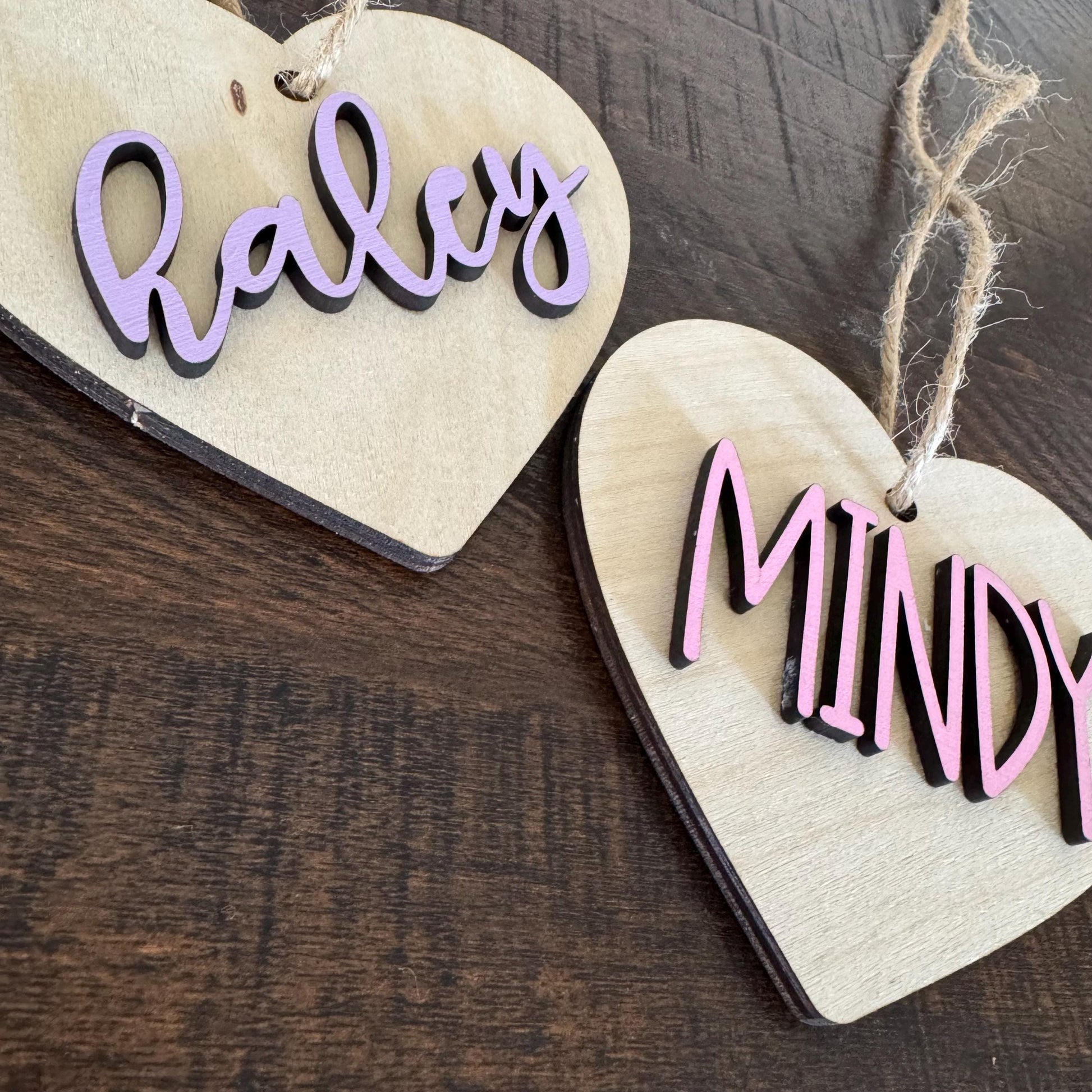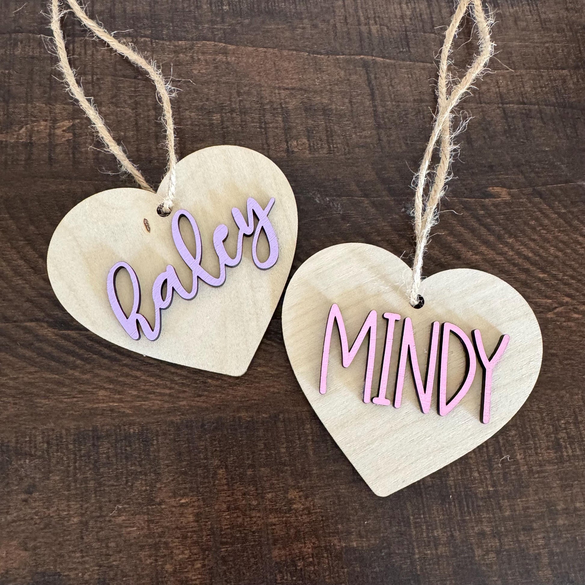 Each tag measures approximately 3.5" tall and 4" wide. The heart layer is made of r1/8" unfinished wood The Personalized Names are applied as a top layer using 1/8" painted MDF board. A jute cord is attached to the tag for easy hanging.